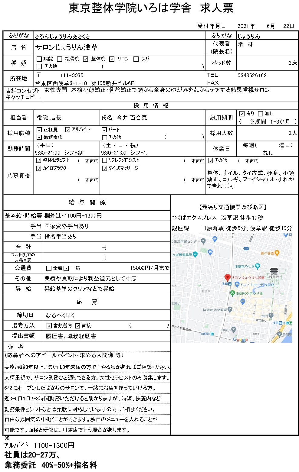 生徒さんが店長のサロンでの求人のお知らせ(浅草) お知らせ Twitter Facebook Hatena Bookmark Pocket LINE Copy 2021.06.22 生徒さんが浅草にオープンしたばかりの女性専用整体エステサロンにて、 店長を務めることになりました。ついては一緒に働いていただけるセラピストさん募集のお知らせです。「サロンのオープニングに携わりたい」 「自分の独自メニューで施術したい」 という方にオススメです。 お申込み、お問合せは、 サロンのお電話 03-4362-6162 へお願いいたします。 お電話に出られない際は、 留守番電話にメッセージをいれていただければ折り返しされるそうです。 Follow me! FacebooktwitterHatenaPocketCopy